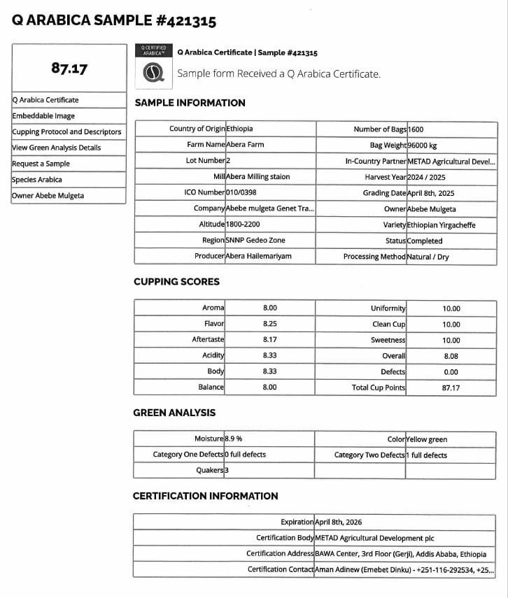 規格:G-1、スペシャルティ、Q grade; 87.17